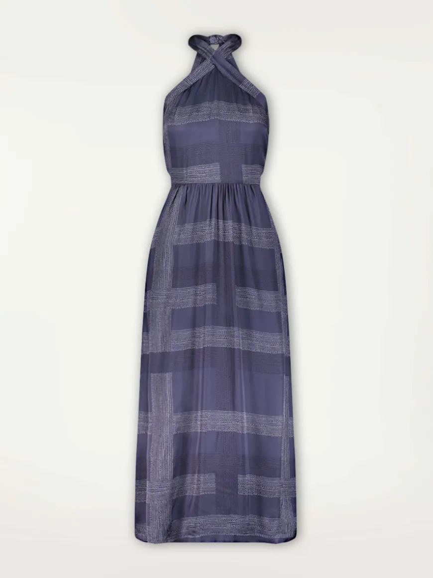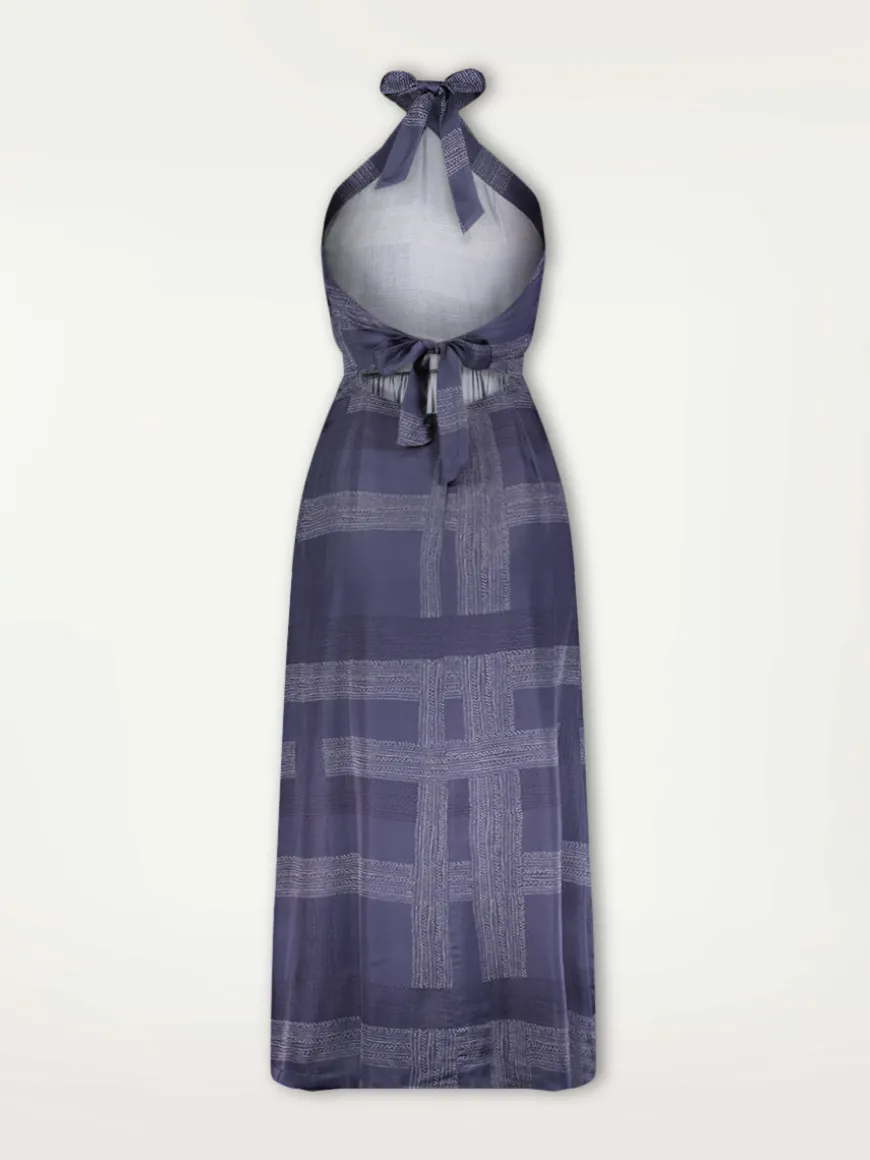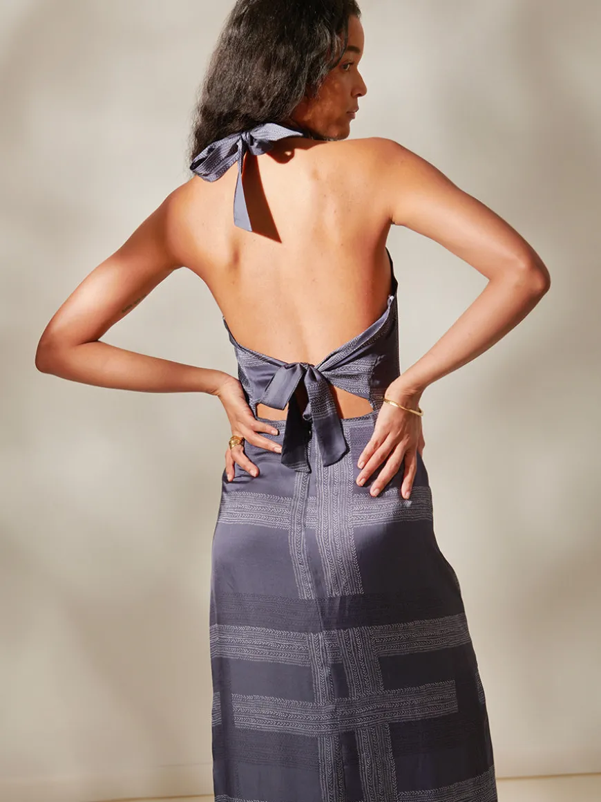 The halter dress features adjustable ties at the neck and back waist, along with a back zipper and darts. It boasts side slits and a fixed waist, creating an elegant and effortlessly relaxed A-line silhouette.