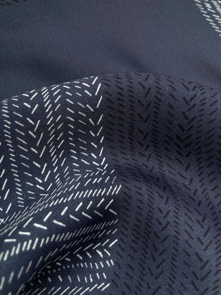 The luxurious silky fabric of the Bezu collection features an elegant hand-sketched chevron pattern, featuring alternating neutral and charcoal stripes set against a cool steel blue background.