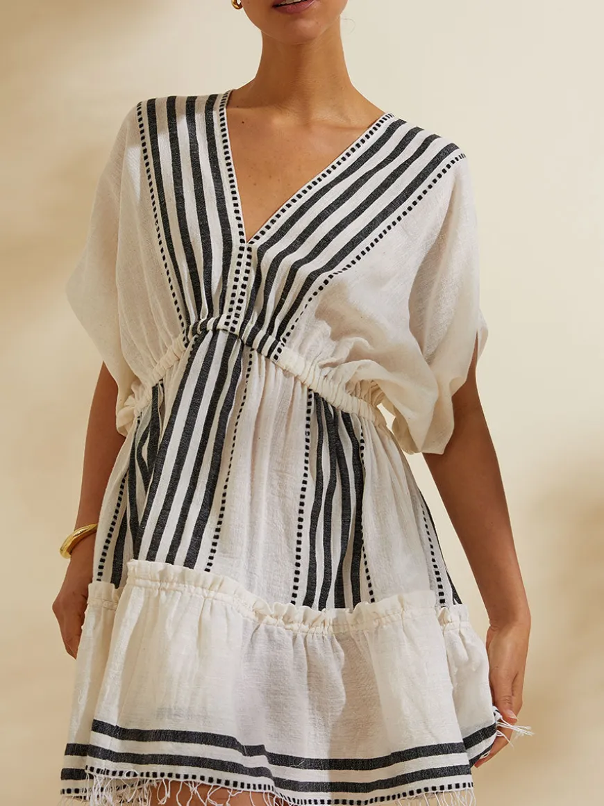 This versatile short dress features dolman sleeves, a deep plunge neckline and comfortable elastic waist to create an hourglass silhouette. The ruffled hem makes this style a resort wear staple.