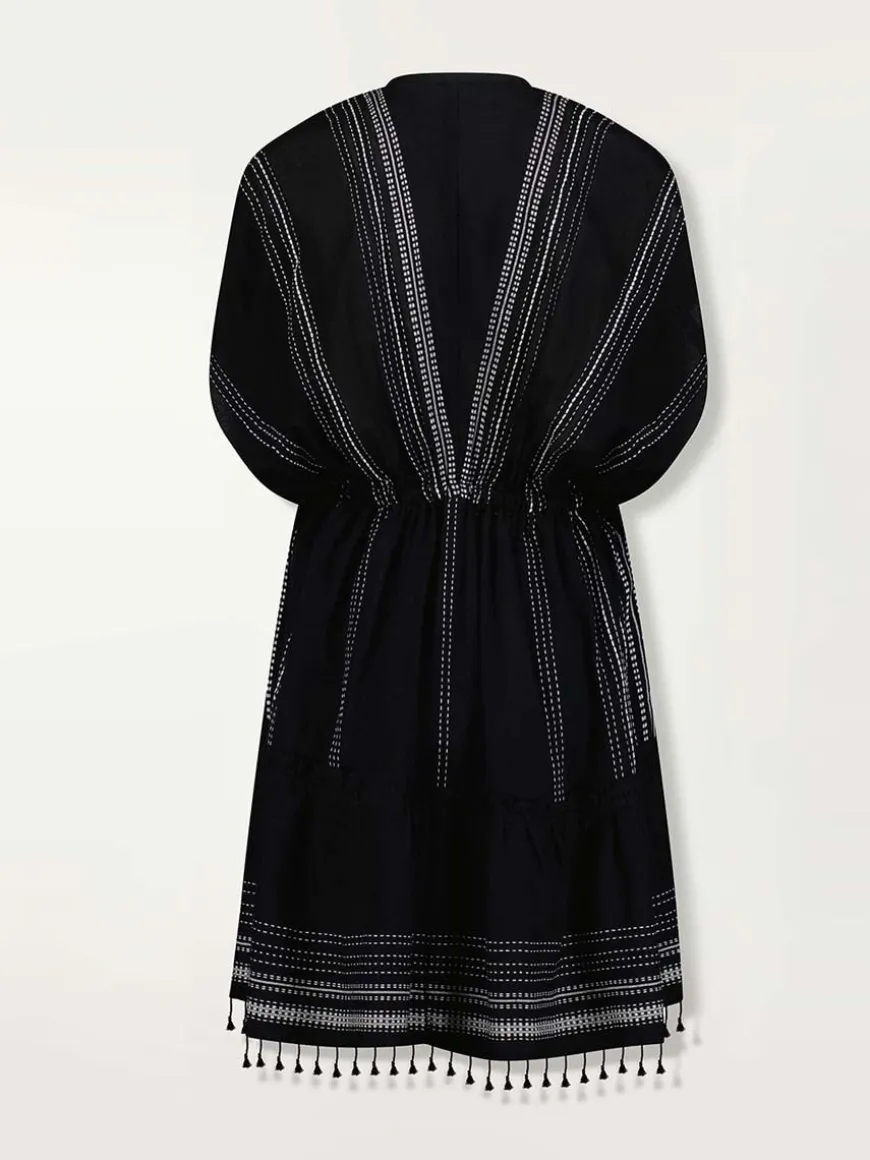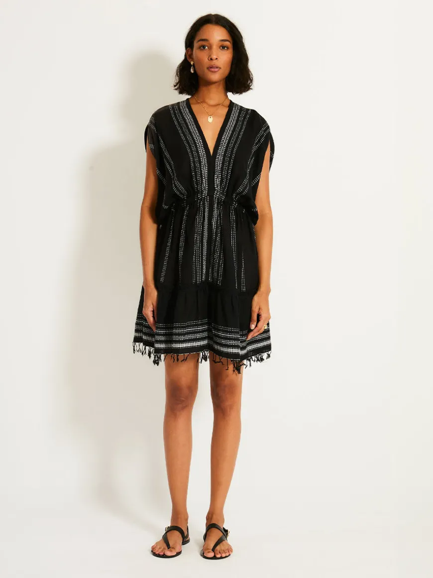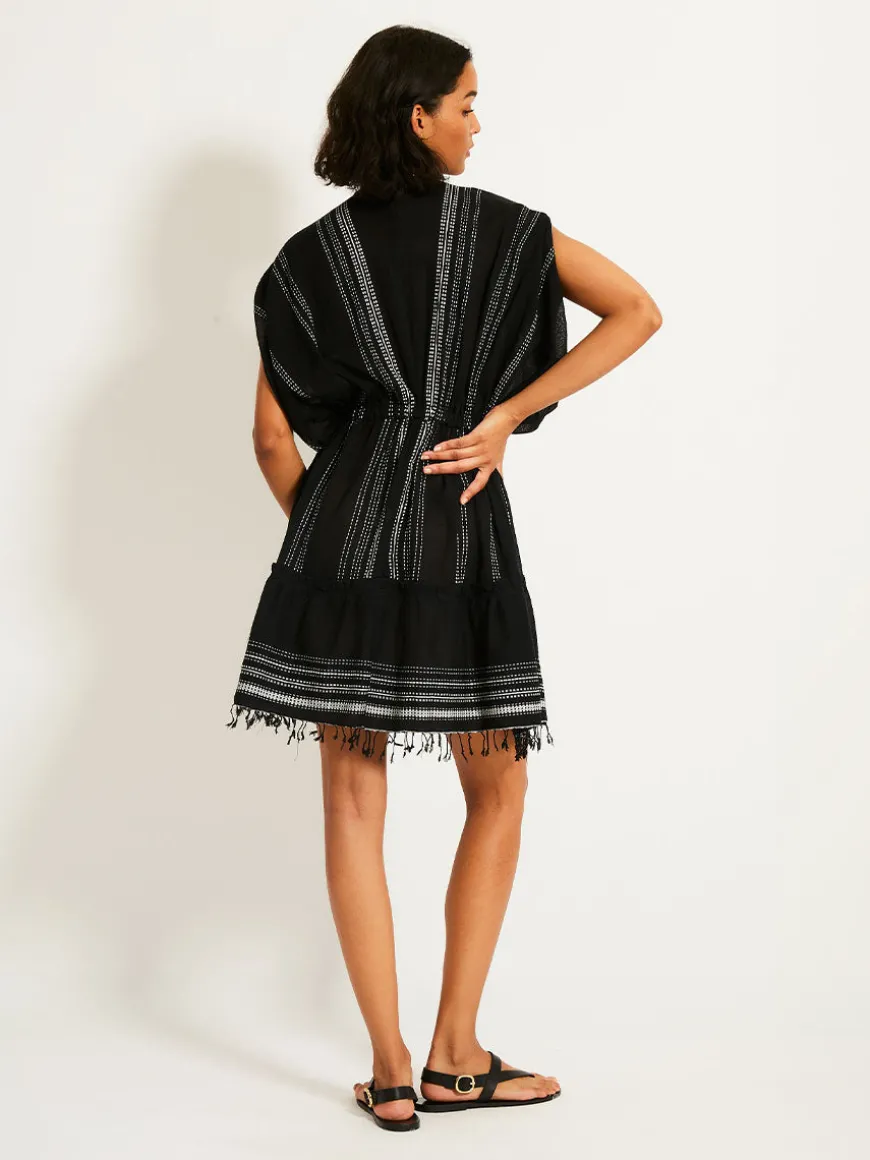 This versatile short dress features dolman sleeves, a deep plunge neckline and comfortable elastic waist to create an hourglass silhouette. The ruffled hem makes this style a resort wear staple.