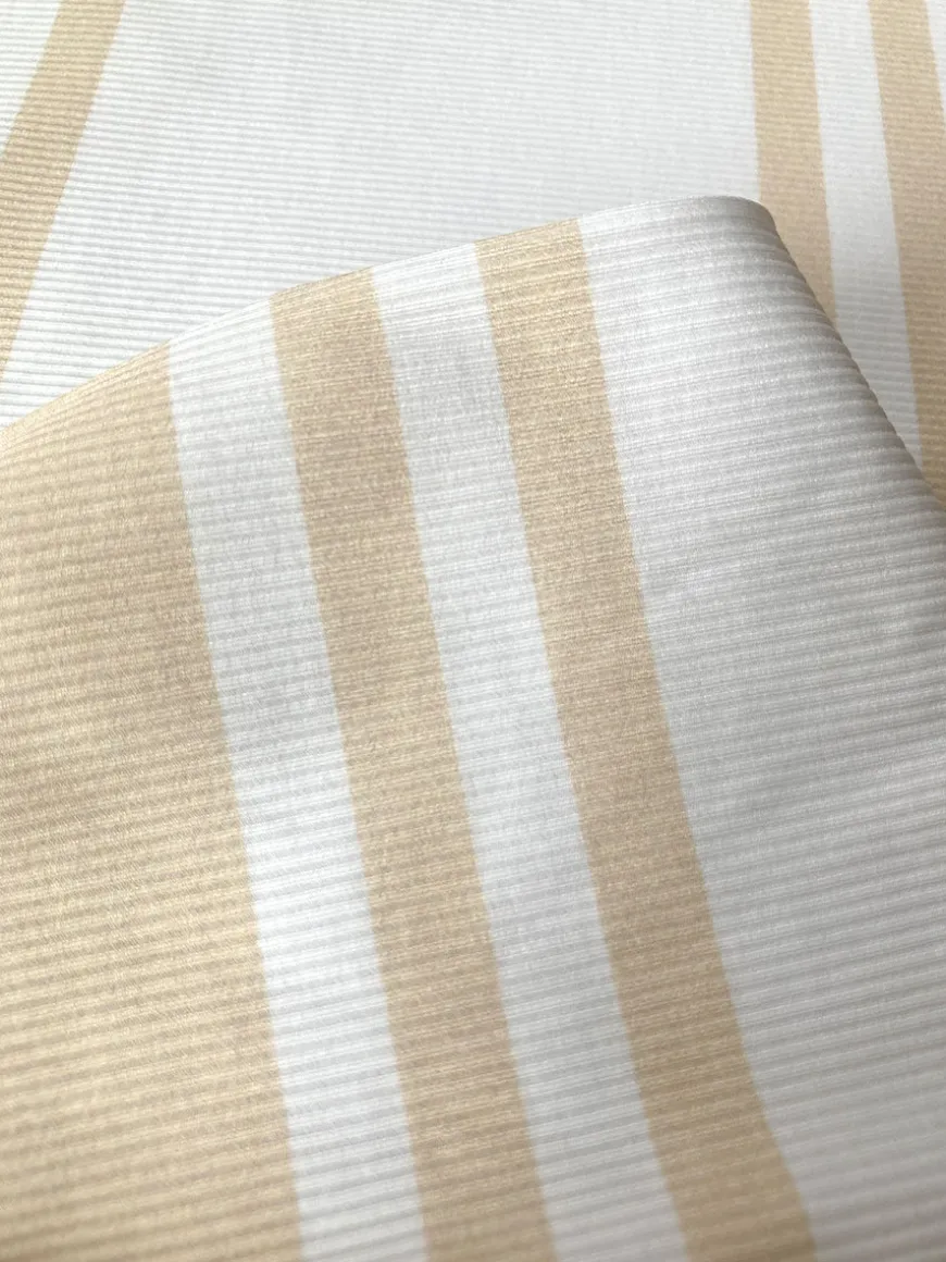 The Ayele Cappuchino Swim Collection is a new take on natural swim, features bold stripe pattern in subtle neutral tan color on classic white ribbed ground