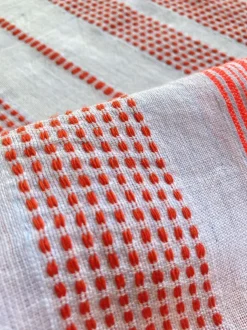 The Tiki Skypop Collection features playful pattern of red dots becoming stripes on a pale blue background. The infusion of unexpected colors and playful design perfectly captures the essence of lemlem.
