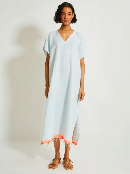 This classic caftan features a plunge neckline, short cap sleeves, hand-twisted fringe hem making it the perfect beach cover-up.