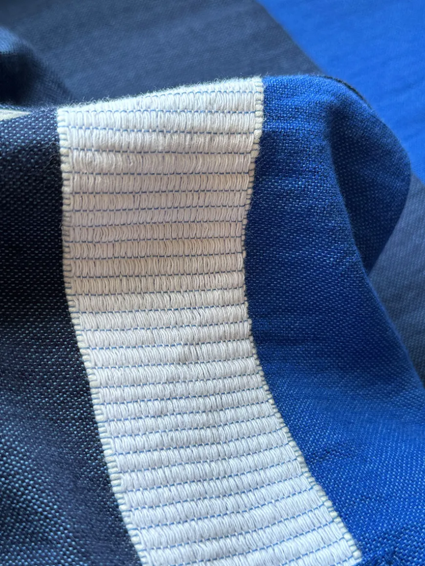 The Betami Azure Collection features a striking color-block combination of three shades of blue, paired with bands of neutral cream and white, inspired by handmade indigo quilting and African textiles.