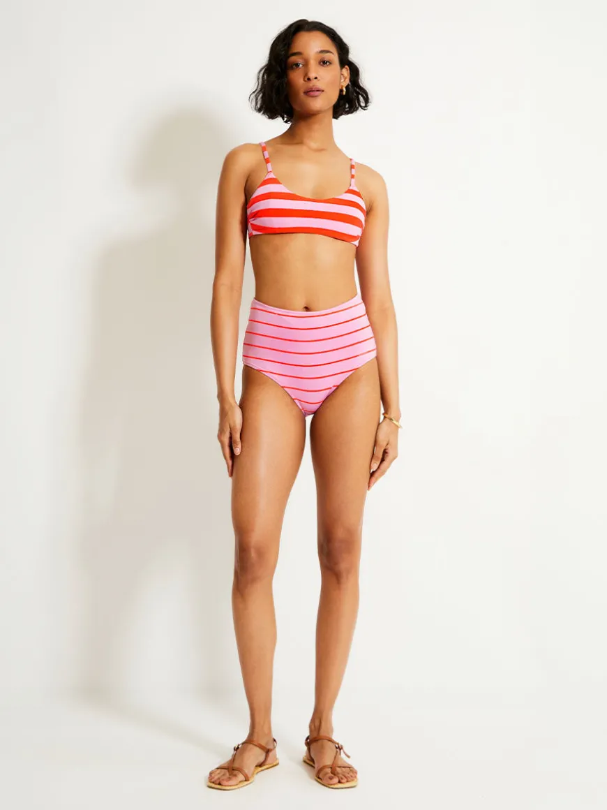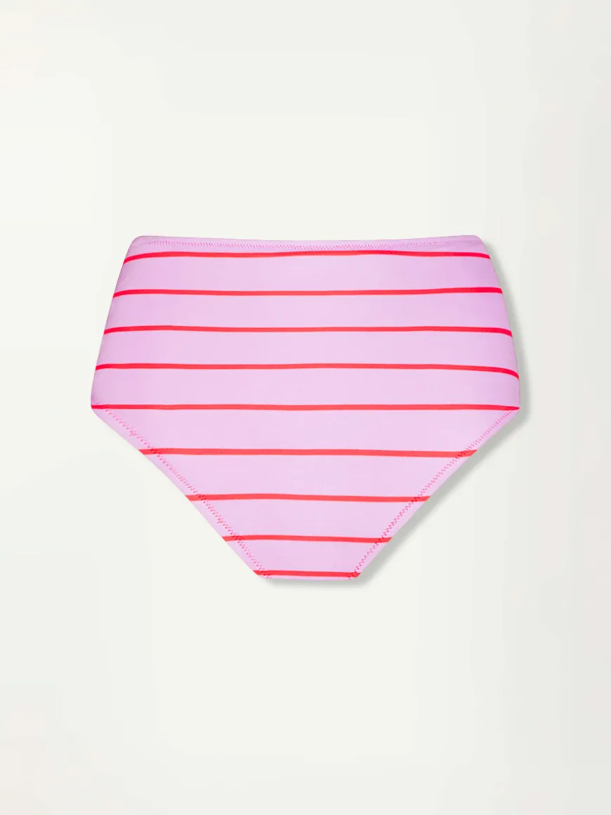 The fully lined high waist bikini bottom offers a flattering and moderate coverage with its low-cut leg opening. The bow tie in the back adds a touch a elegance to the silhouette.