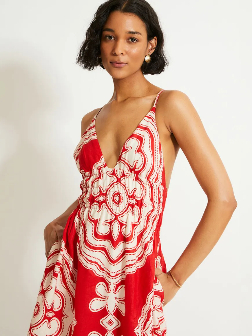 This elevated take on the classic sundress features a deep V neckline, elastic ruching at the waist, and a fluid, breezy, long skirt. It also includes adjustable straps that can be worn as a cross-back or a halter.