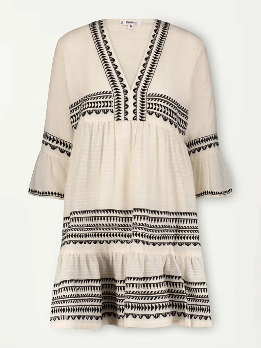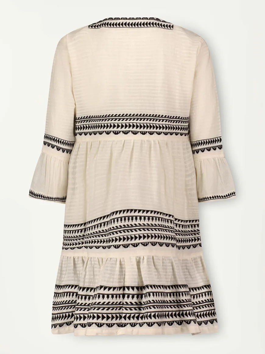 This flutter short dress features fluttery ¾ bell sleeves, a plunge neckline, and breezy tiered ruffled hem. The empire waist creates a flattering everyday silhouette.