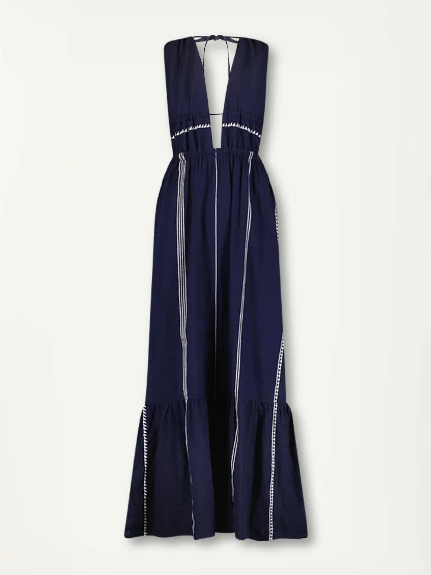 This maxi V-neck dress features a deep plunge neckline, bare sides, and maxi length for a showstopping silhouette. This dress comes with straps that can be adjusted for a perfectly customized fit.