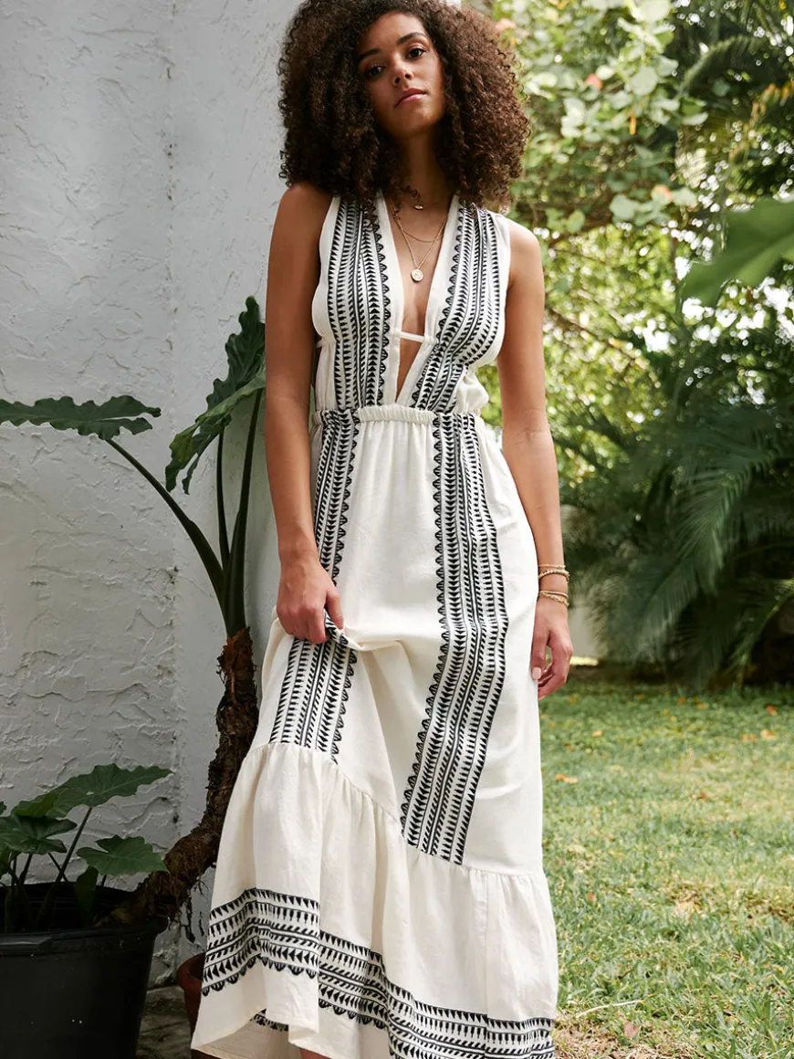 This maxi V-neck dress features a deep plunge neckline, bare sides, and maxi length for a showstopping silhouette. This dress comes with straps that can be adjusted for a perfectly customized fit.