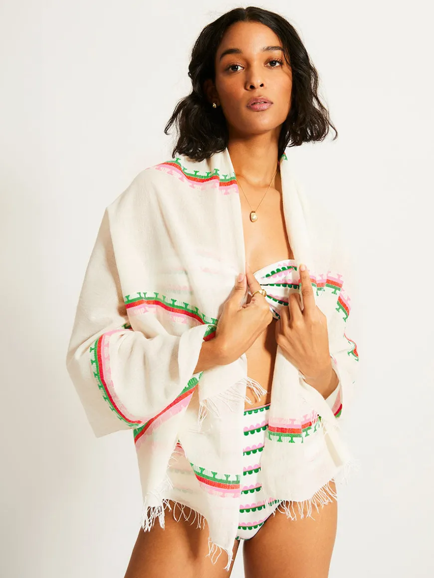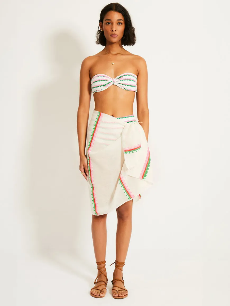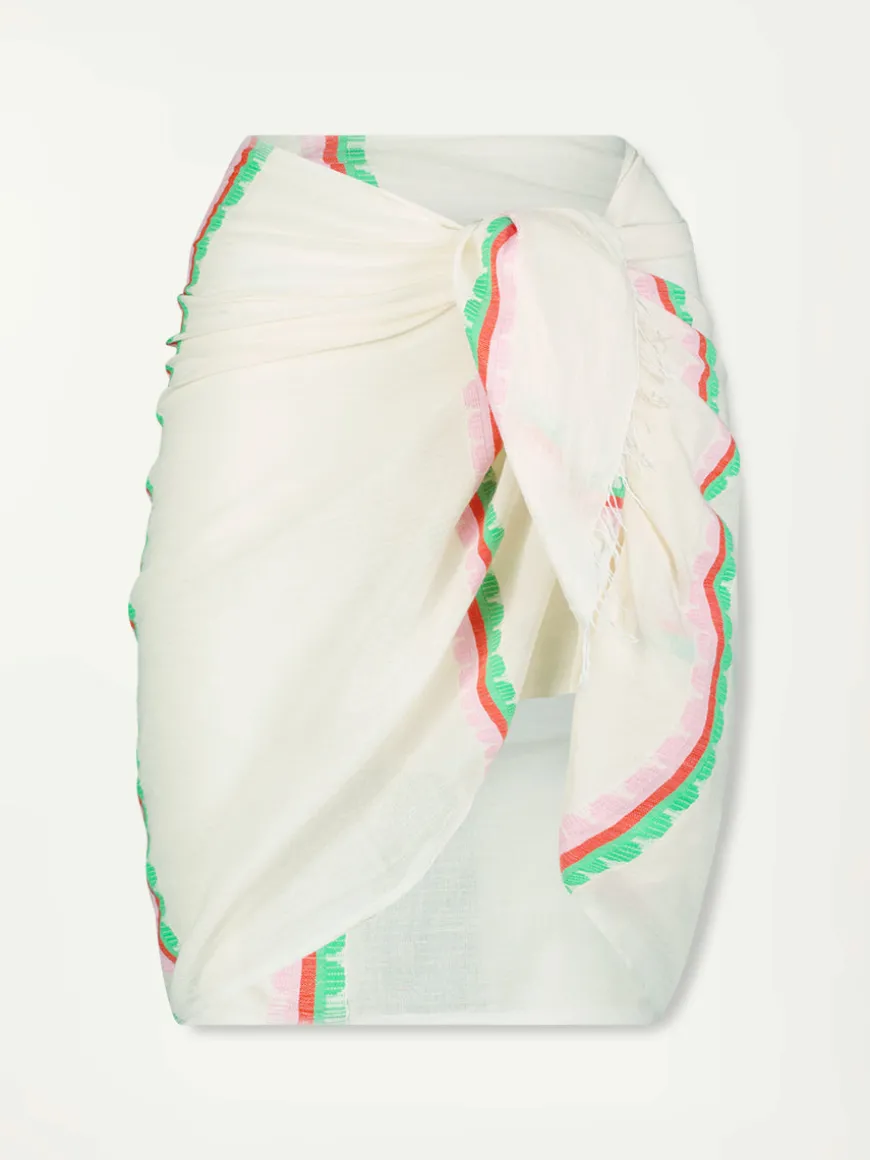 This sarong is designed to be worn a number of ways: as a scarf around the neck; a cover-up around tie around the chest; a pareo tied around the waist or laid flat as a beach blanket, this versatile style is a beach wear essential.