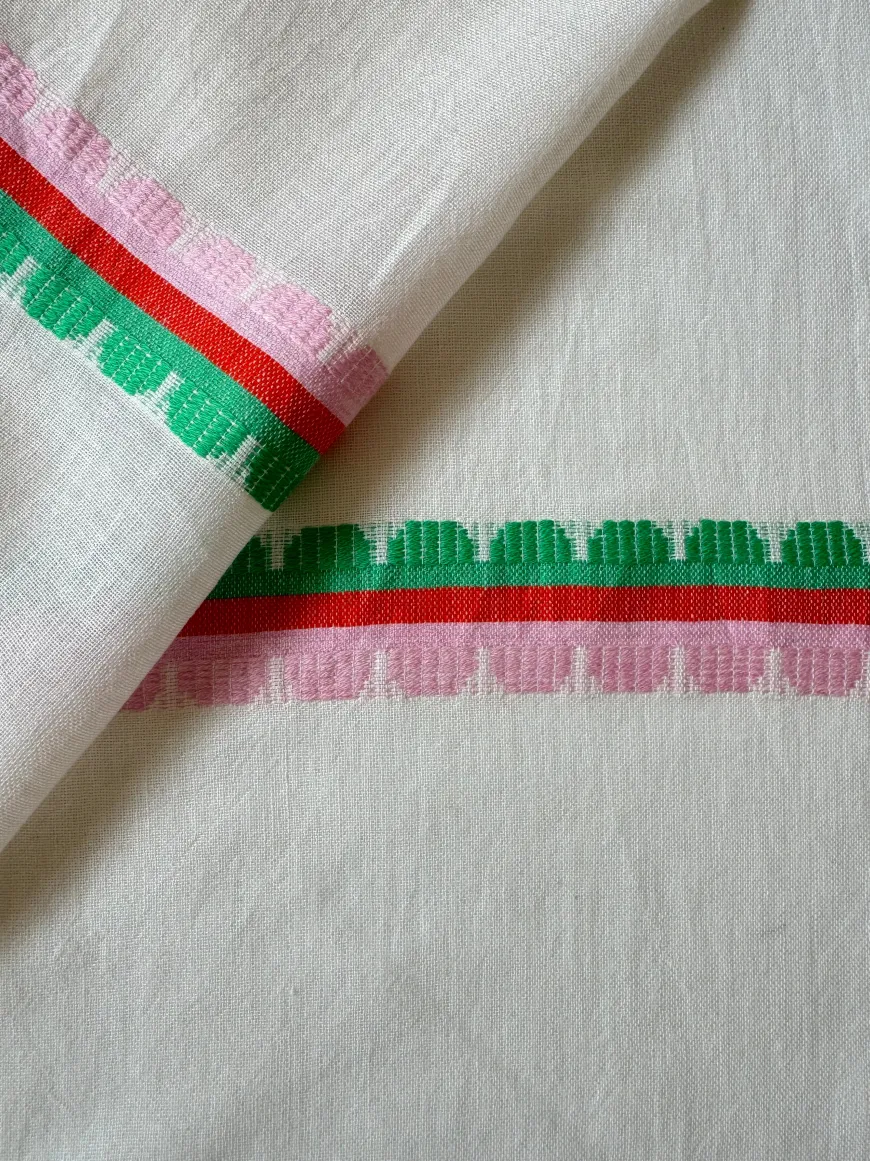 The Kibebi Fragaria Collection features a playful, preppy scalloped Tibeb weave with vibrant green, soft pink, and fiery red accents.
