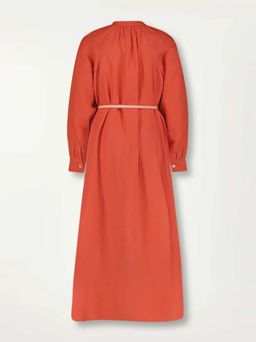 The voluminous Makeda dress features a stand collar, shell buttons, a ruched neckline, raglan sleeves, and front slits. It’s slightly oversized and comes with hip pockets, a self-belt, and button cuffs. The unlined dress can also be sized down for a more tailored fit.