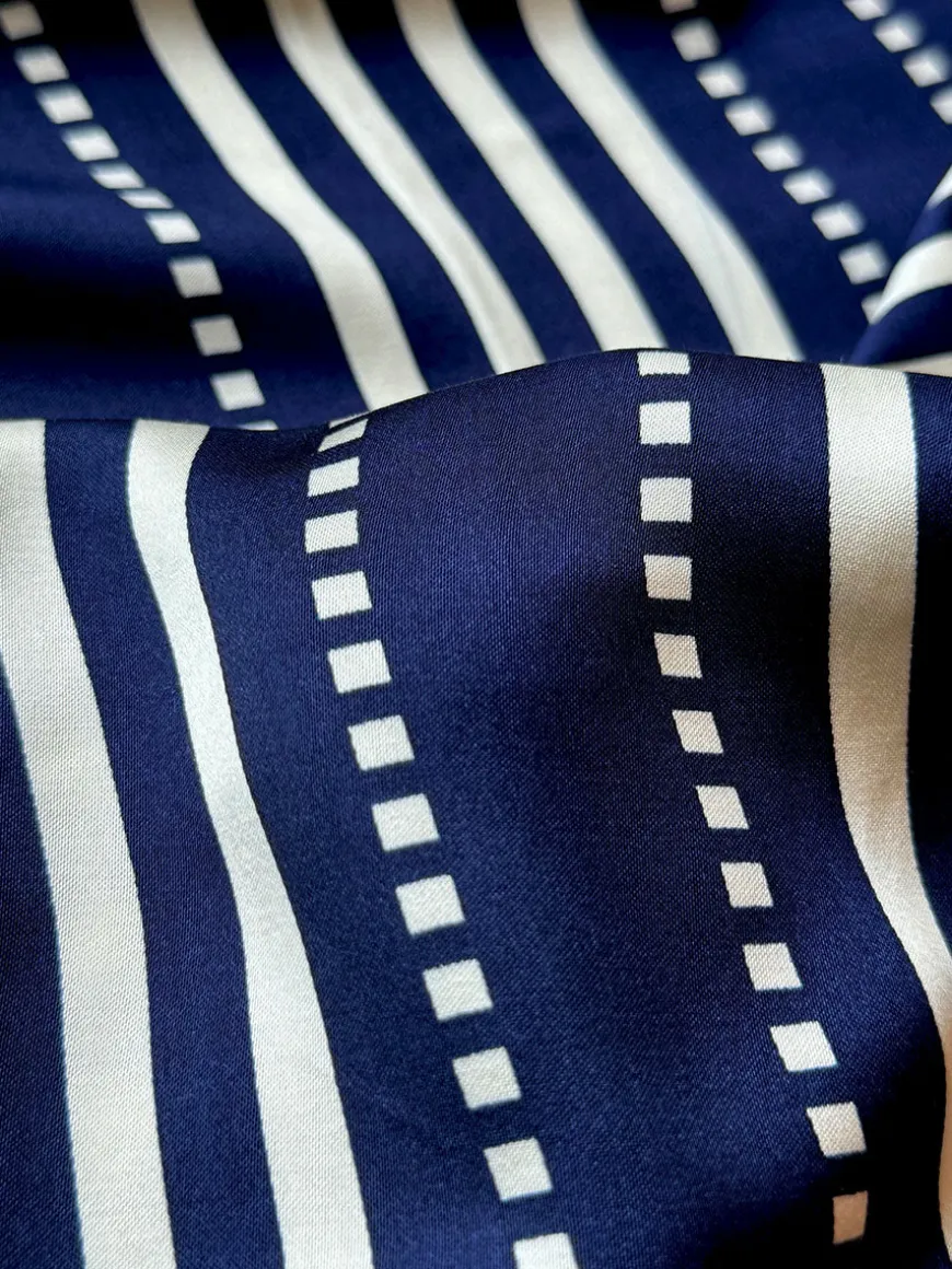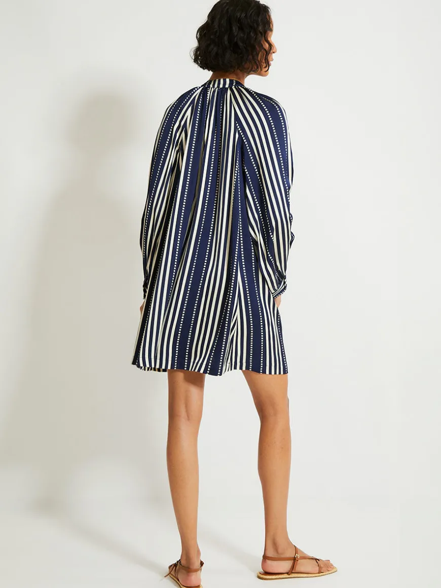 The Eshe Navy Collection is a fresh new take on a lemlem classic, featuring a classic navy background with ivory stripes and dots, offering a look that’s less beach and more chic.