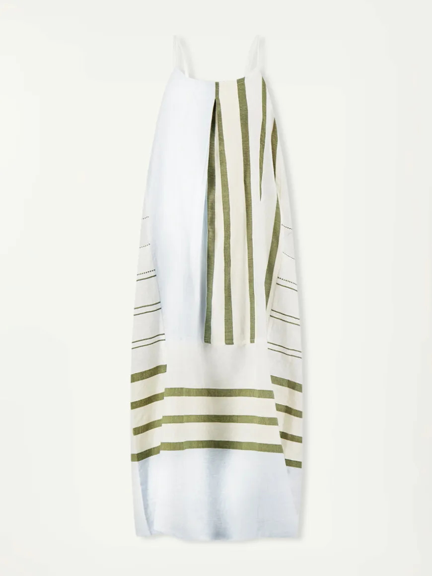 The Entoto Sage Collection features a bold asymmetrical color-block pattern, where airy light blue effortlessly blends with soft sage and cream, creating a fresh, clean, and feminine look.