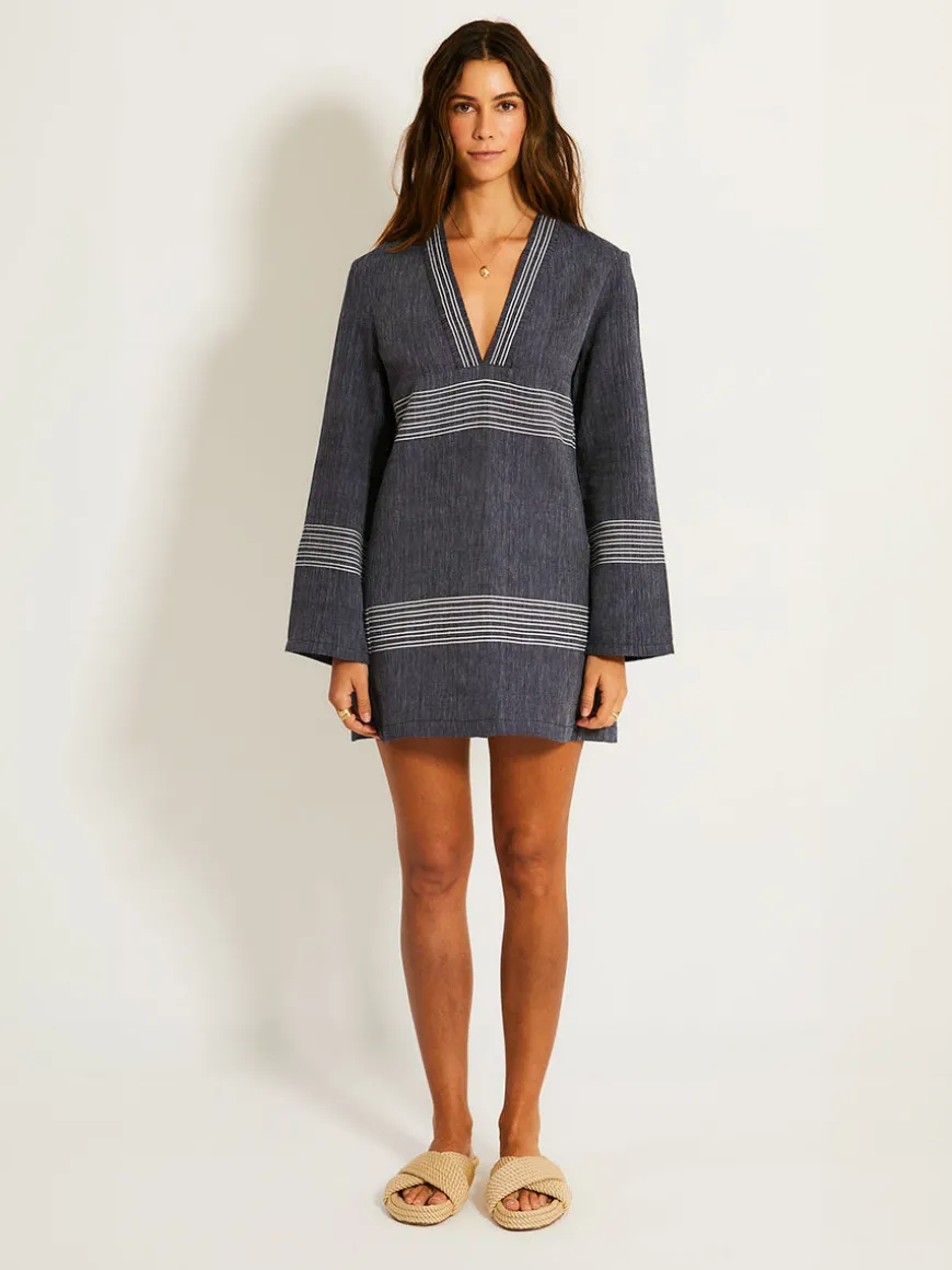 This chic mini dress features a relaxed silhouette with a flattering V-neckline and long sleeves for an effortlessly stylish look. Playful sheer stripes add a touch of fun to this silhouette.
