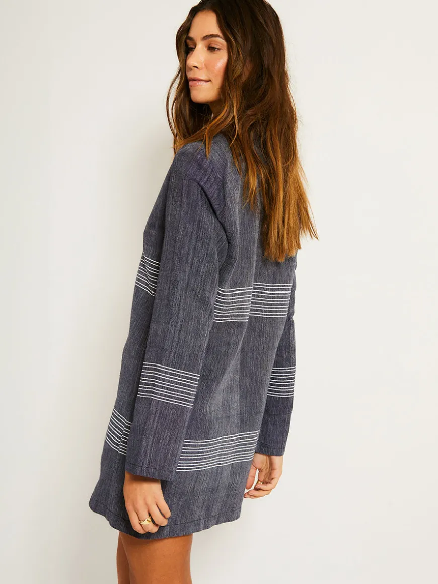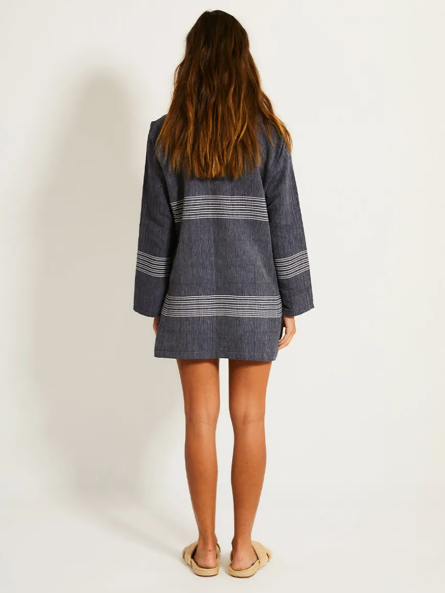 The Mari Navy Collection features chambray navy color accented with fine, textured white stripes, creating a sophisticated denim-inspired look.