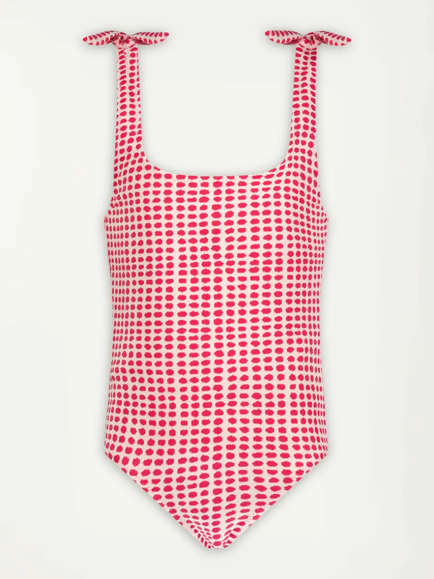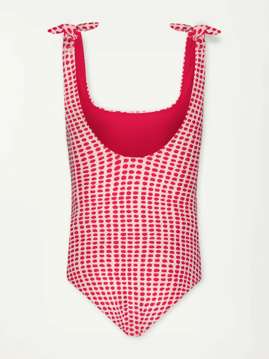 The Sisay Swim collection showcases vibrant raspberry dots on an ivory background, adding a lemlem twist to the classic gingham pattern. The textured stretch fabric on the outside and the silky pink lining inside provide a unique fit.