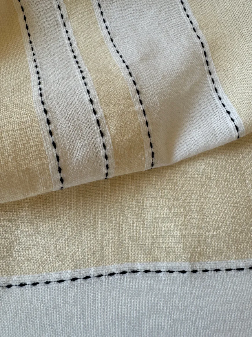 The Debre Cream Collection features bold stripes in bright white on a vanilla cream background, accented with navy pick stitch detailing. Inspired by African textiles, these engineered stripes create the impression of applique while being seamlessly woven into a single, sophisticated design.