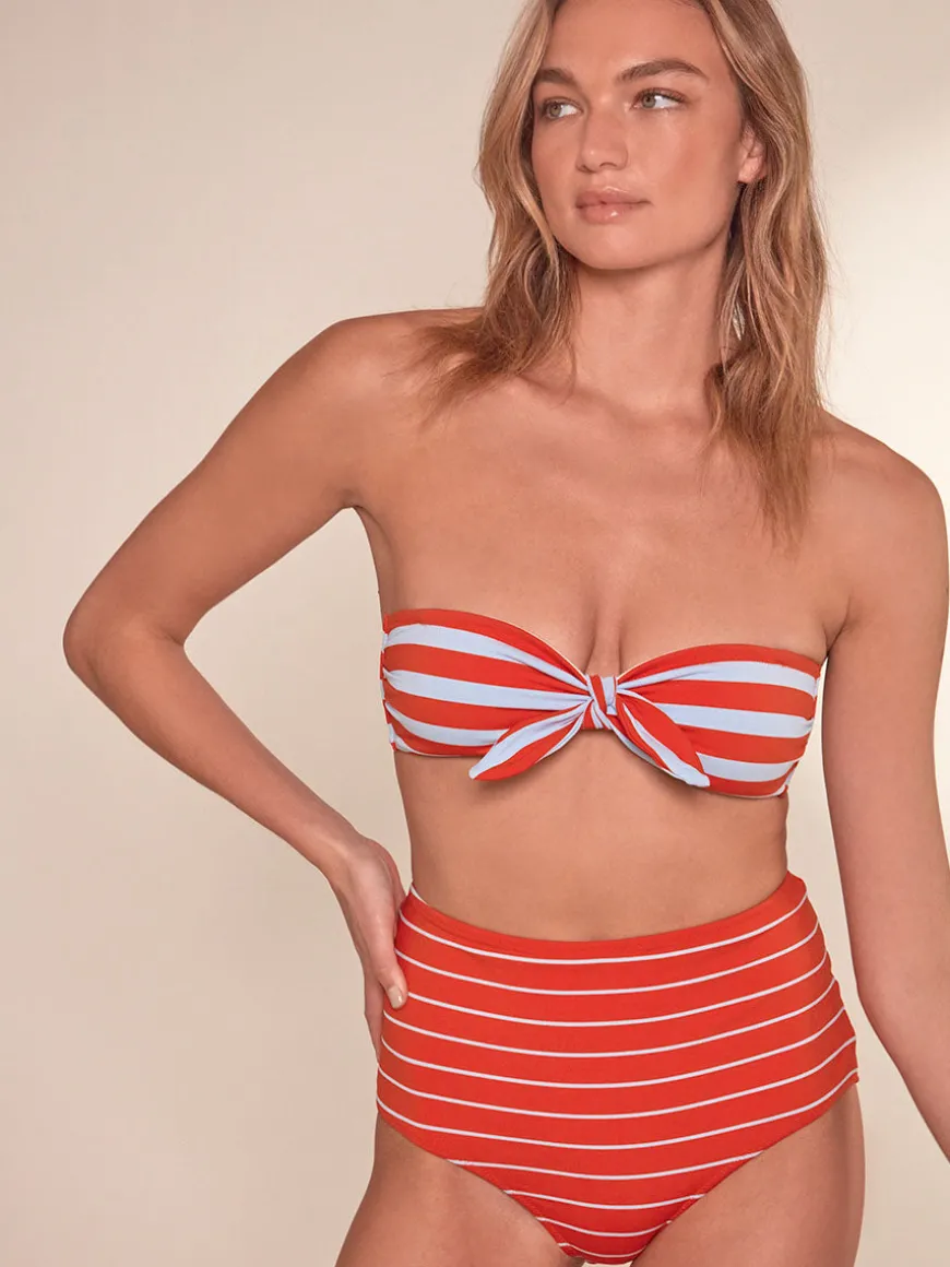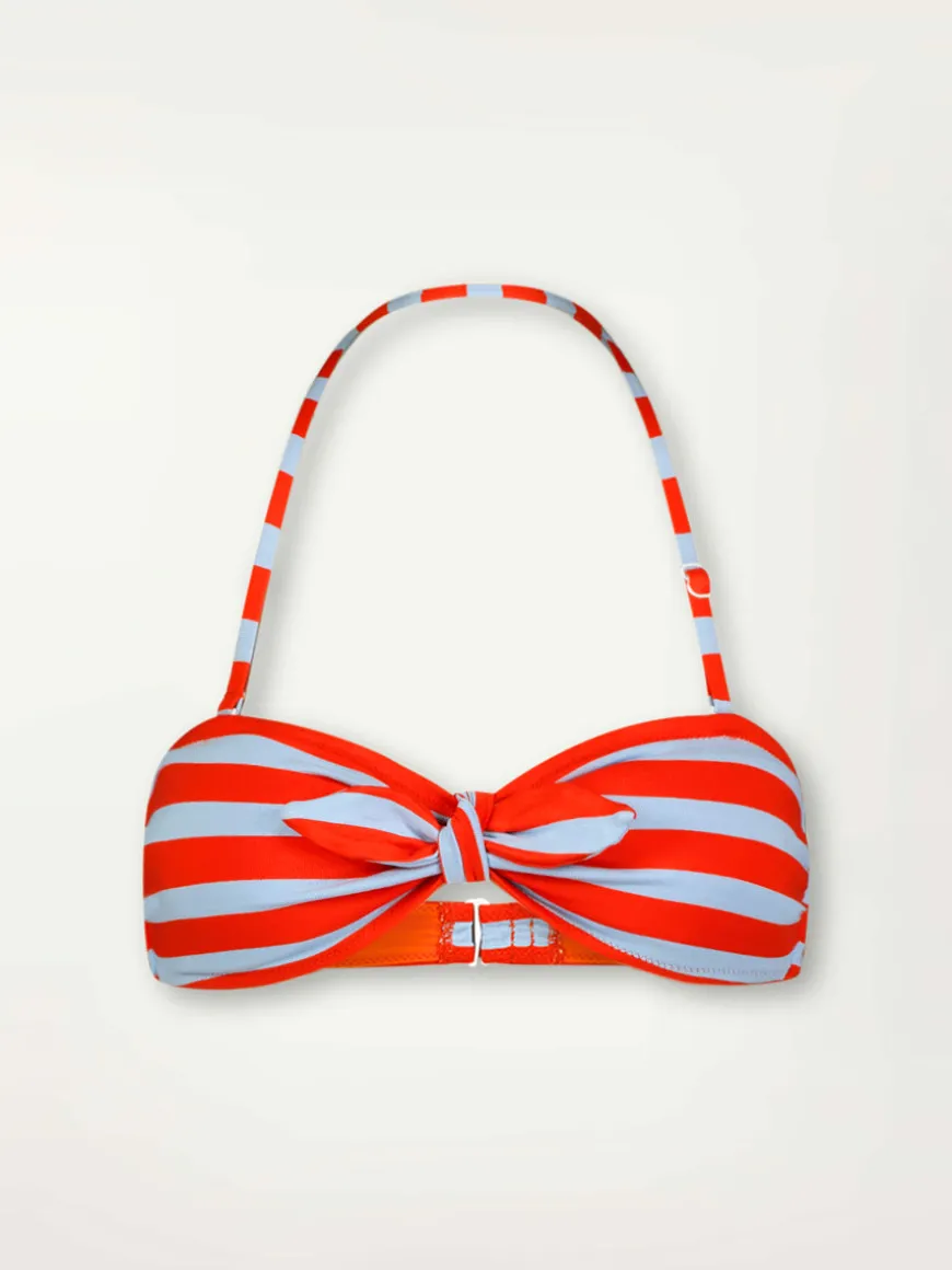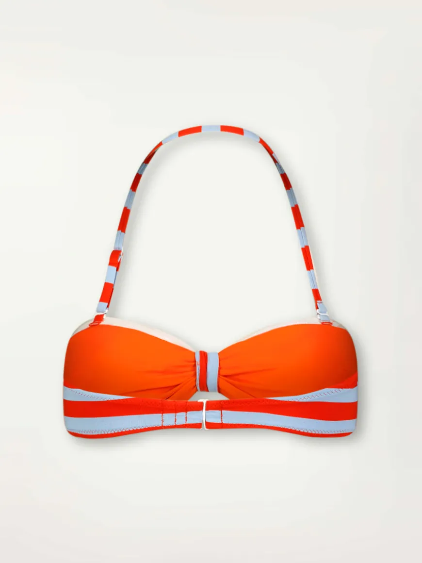 The fully lined bandeau top is a truly versatile swimsuit option to pair with any bikini bottom. The top offers a removable halter strap and bust tie for multiple styling options. The back hook closure and removable padding provide a comfortable and adjustable fit.