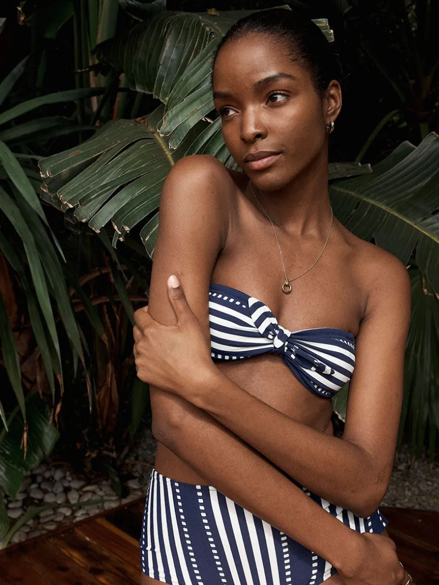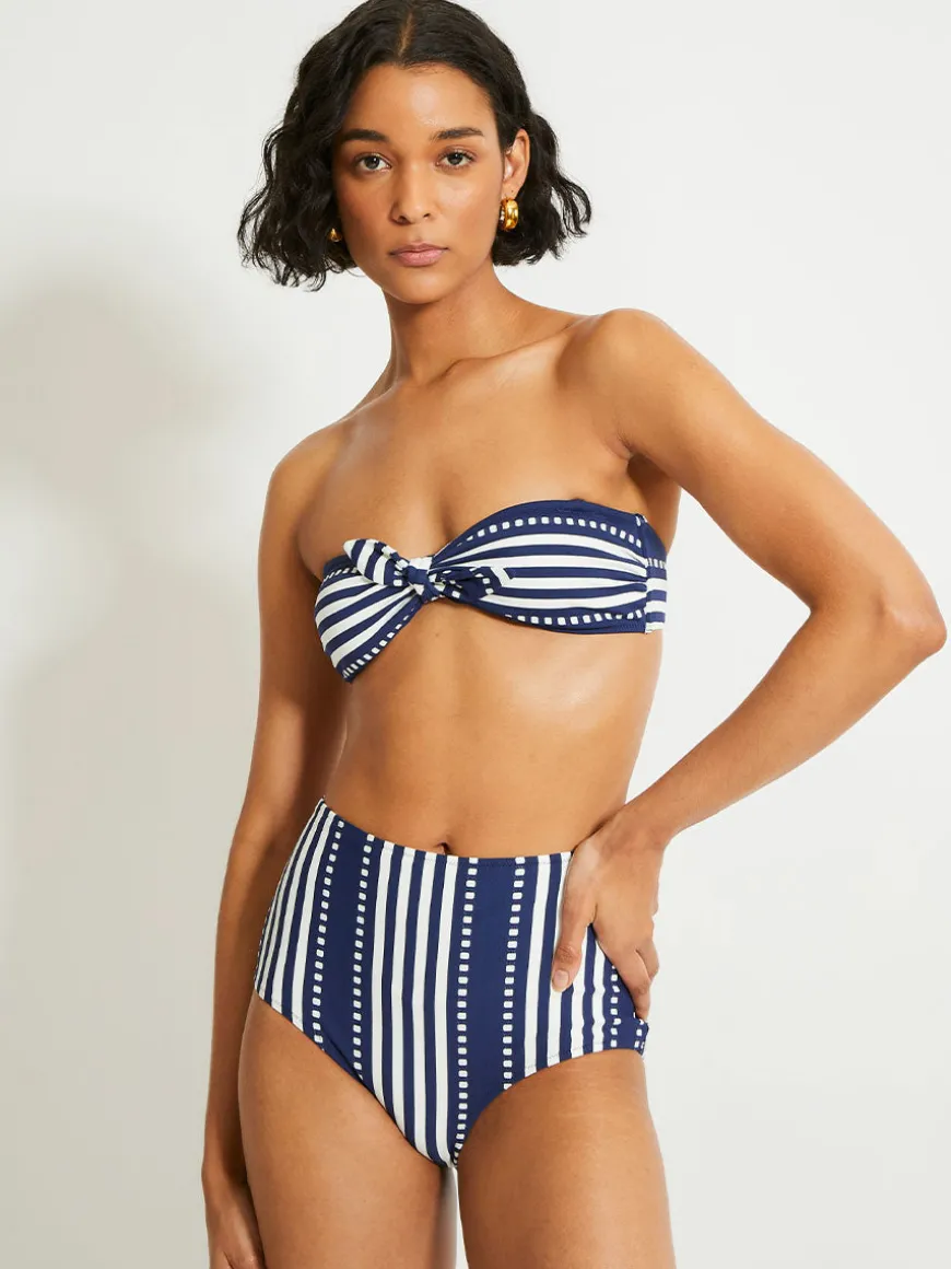 The Eshe Navy Collection is a fresh new take on a lemlem classic, featuring a classic navy background with ivory stripes and dots on a silky fabric, offering a look that’s less beach and more chic.