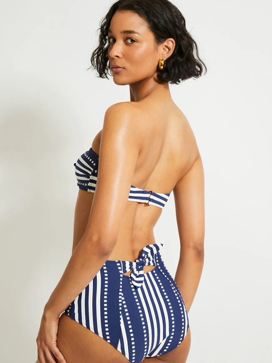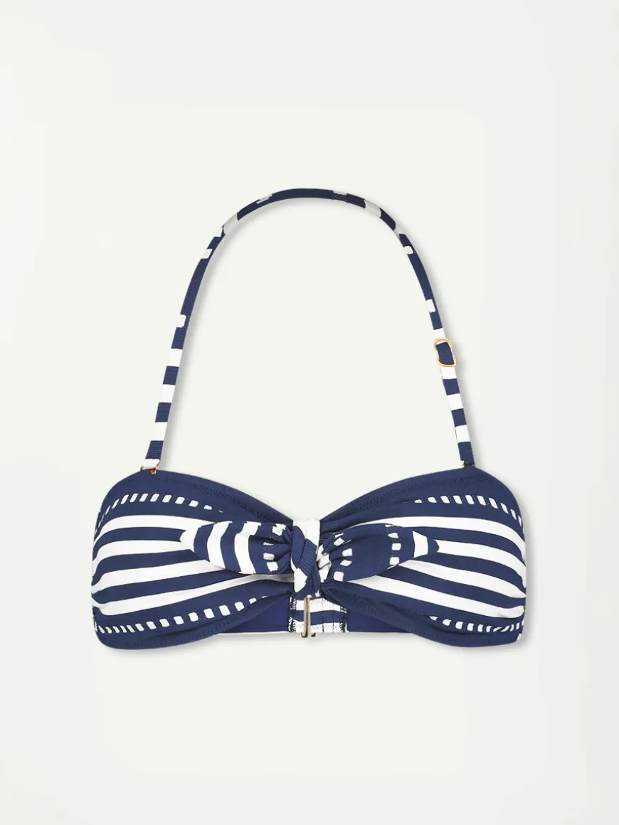 The fully lined bandeau top is a truly versatile swimsuit option to pair with any bikini bottom. The top offers a removable halter strap and bust tie for multiple styling options. The back hook closure and removable padding provide a comfortable and adjustable fit.