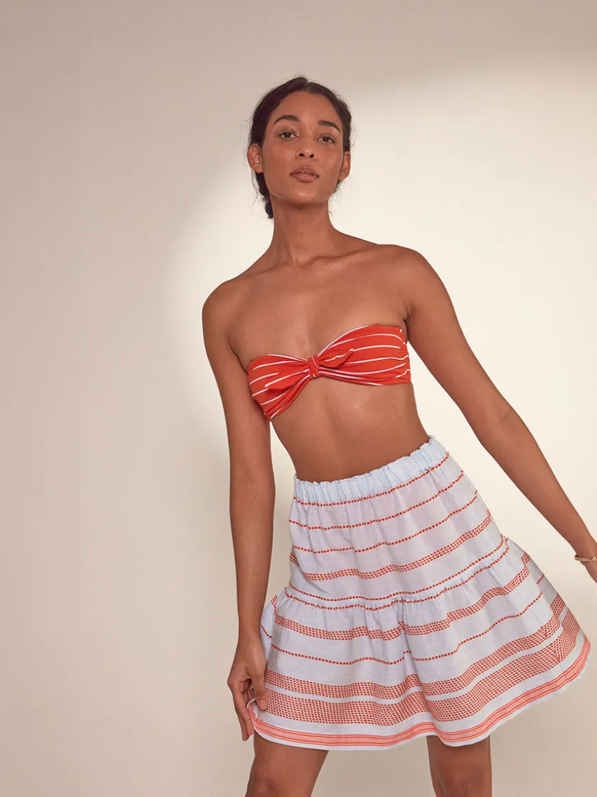 The Tiki Skypop Collection features playful pattern of red dots becoming stripes on a pale blue background. The infusion of unexpected colors and playful design perfectly captures the essence of lemlem.