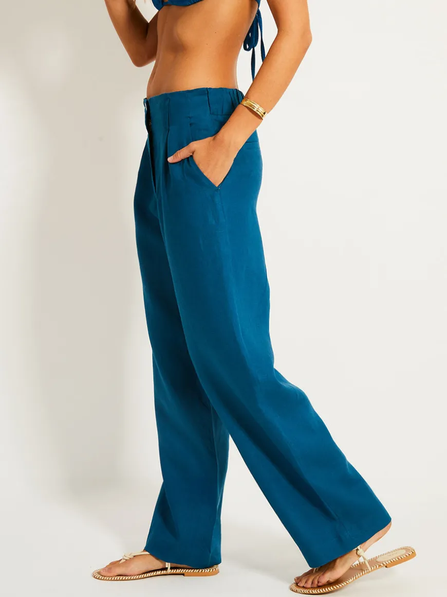 These pants feature a relaxed wide-leg fit with a mid-rise silhouette, perfect for breezy, beachside styling and effortless comfort.