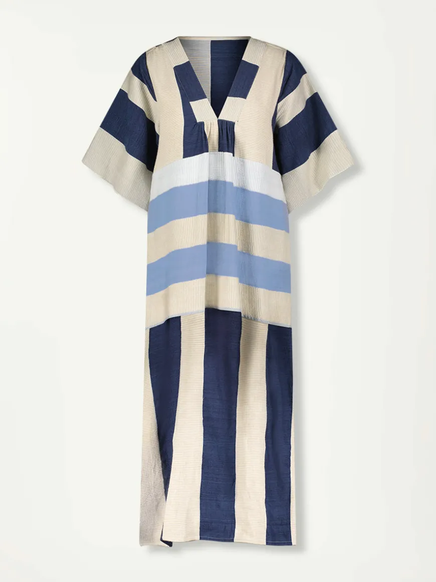 The Betami Azure Collection features a striking color-block combination of three shades of blue, paired with bands of neutral cream and white, inspired by handmade indigo quilting and African textiles.