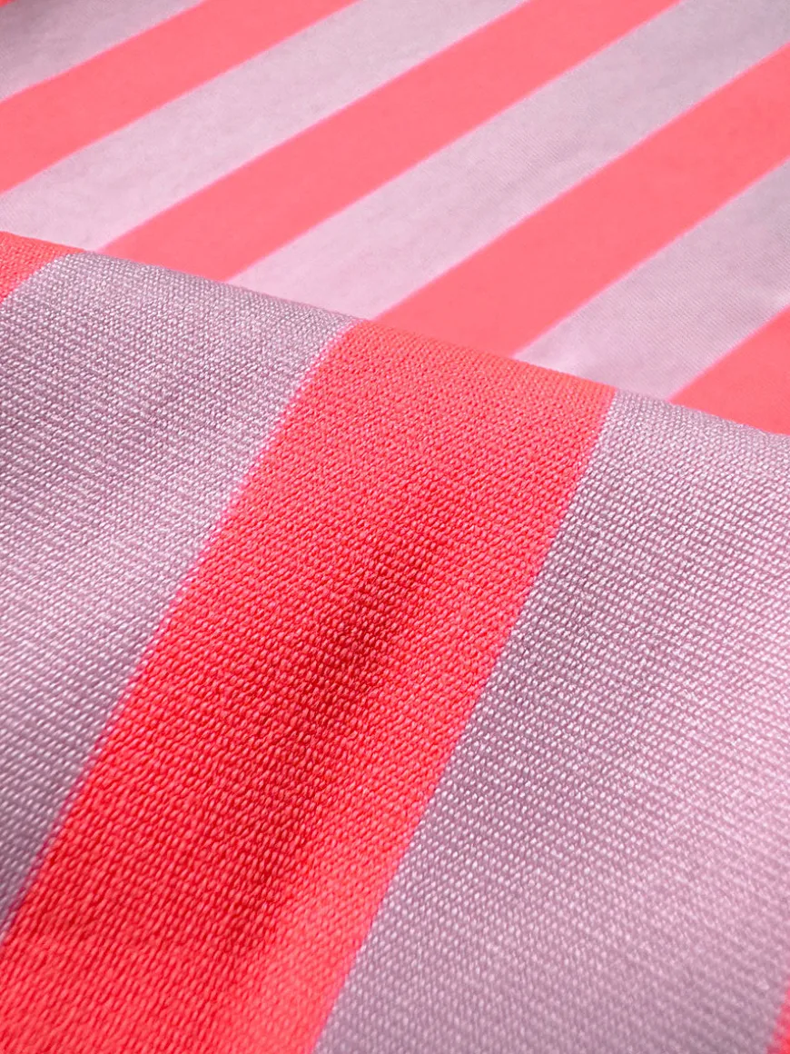 The Chireti Pink Collection showcases a bold and vibrant neon orange red, accented by soft rose stripes, offering a fresh twist on the classic cabana stripe.