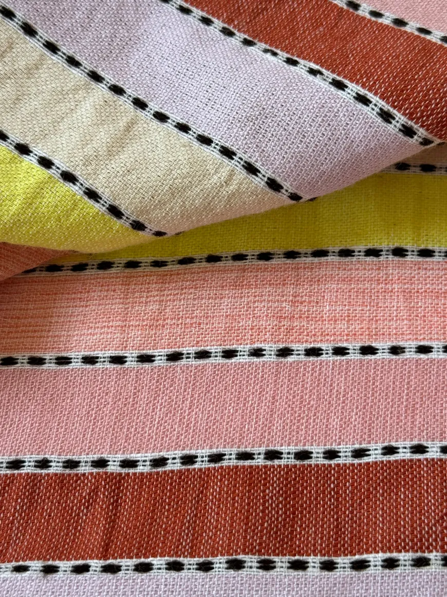 The Meskel Citron Collection features soft sorbet-colored stripes in shades of peach, rust, and orchid, accented with a citrus yellow pop.