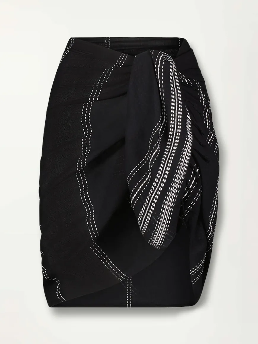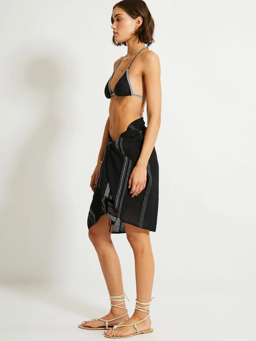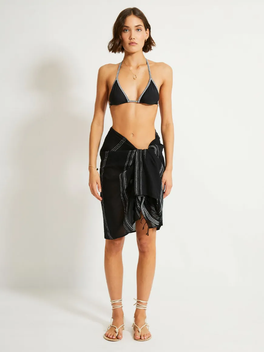 This sarong is designed to be worn a number of ways: as a scarf around the neck; a cover-up around tie around the chest; a pareo tied around the waist or laid flat as a beach blanket, this versatile style is a beach wear essential.