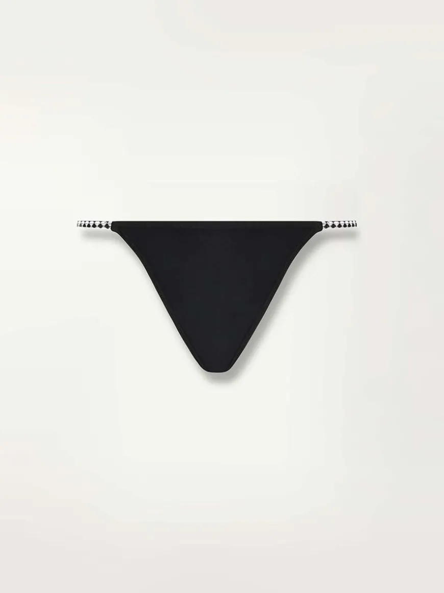 The fully lined brazilian bikini bottom is a cheeky fit featuring high cut leg straps to be worn high on the hips for maximum leg lengthening. Providing minimal coverage, this new modern shape is perfect to pair with a triangle top.