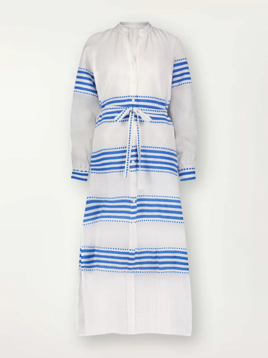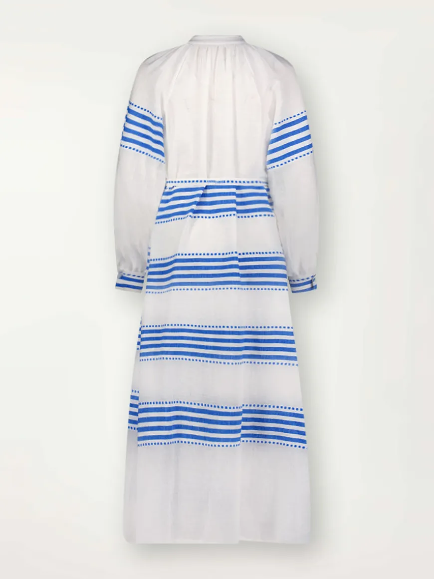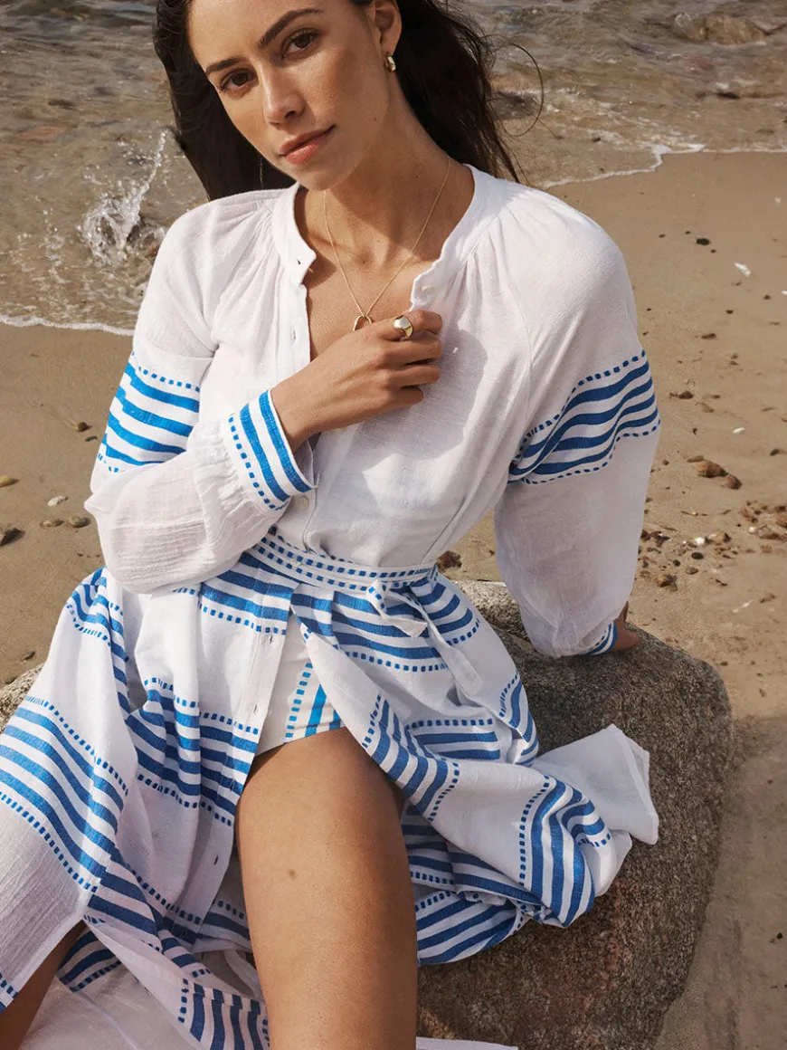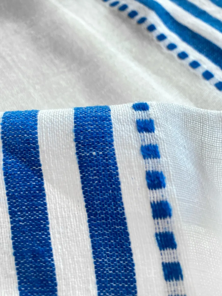 The Eshe Blue Collection is a fresh new take on a lemlem classic. The crisp white background and bright blue stripes and dots pattern evoke the essence of the Mediterranean seaside and sailor stripes.