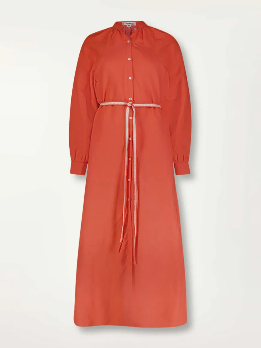 The voluminous Makeda dress features a stand collar, shell buttons, a ruched neckline, raglan sleeves, and front slits. It’s slightly oversized and comes with hip pockets, a self-belt, and button cuffs. The unlined dress can also be sized down for a more tailored fit.