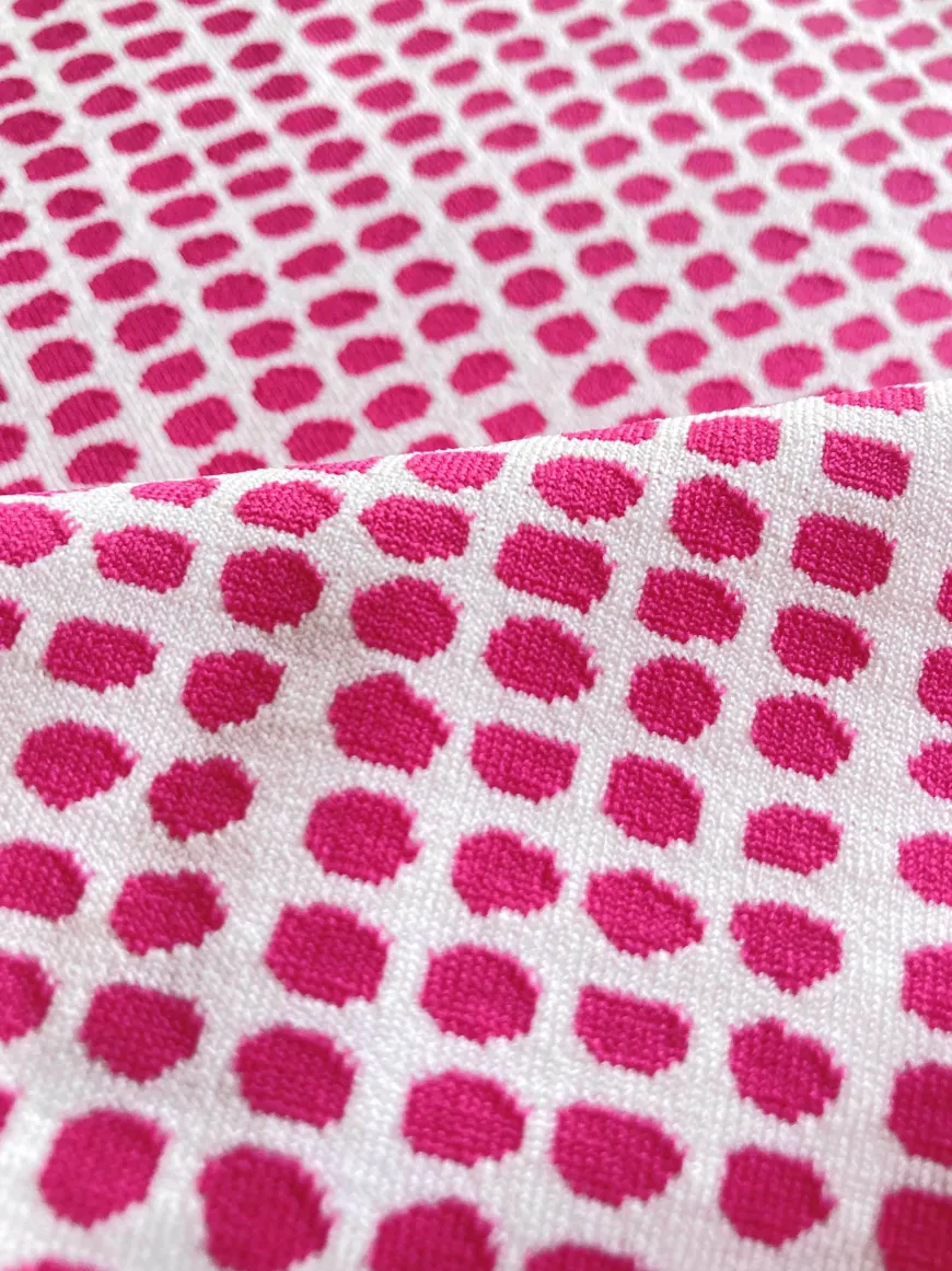 The Sisay Swim collection showcases vibrant raspberry dots on an ivory background, adding a lemlem twist to the classic gingham pattern. The textured stretch fabric on the outside and the silky pink lining inside provide a unique fit.