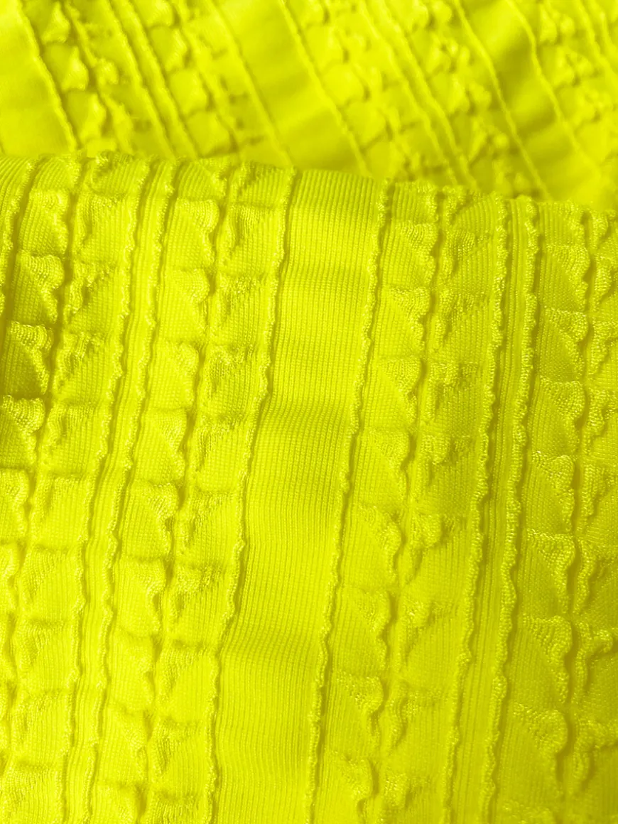 The Jordanos swim collection is made of a custom-created jacquard fabric, featuring a textured down sampled Jordanos pattern in a bright flattering citron color