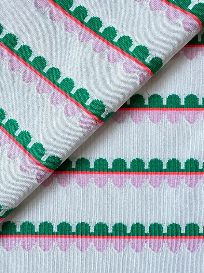 The Kibebi Fragaria Collection features a playful, preppy scalloped Tibeb weave with vibrant green, soft pink, and fiery red accents.
