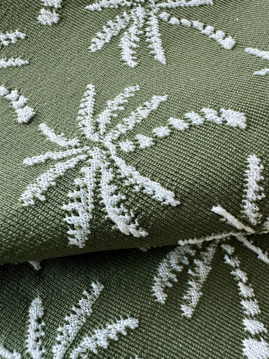 The Zafi Olive Collection showcases a luxurious jacquard fabric adorned with custom-designed knitted palm trees in a soft ivory hue, set against a timeless olive background for a refined and elegant look.