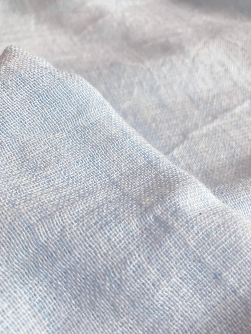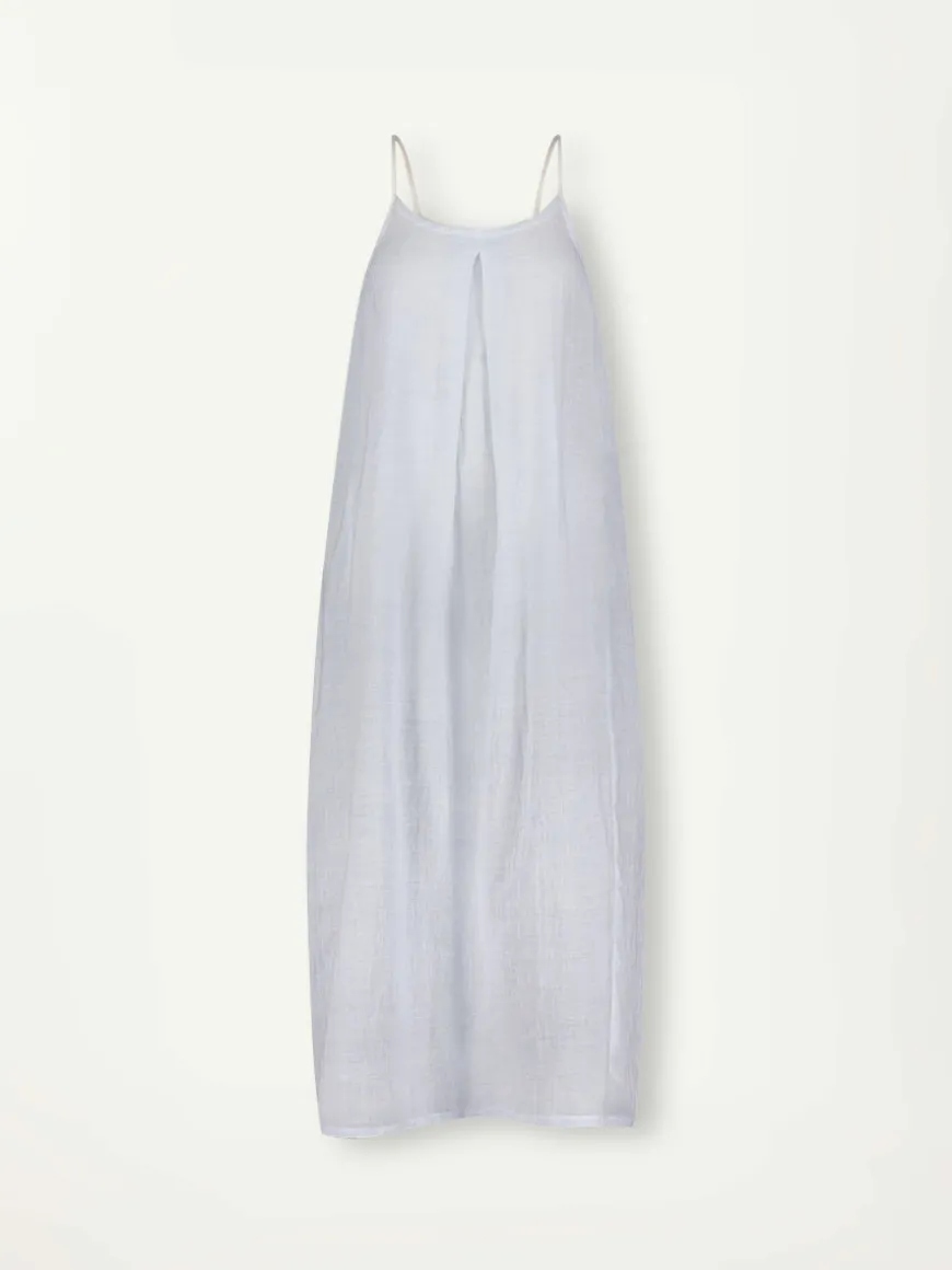 The Nefas Sky Collection features airy gauze fabric in a delicate pale blue color. Perfect for creating a soft and feminine beach look when worn over with colorful swimwear.