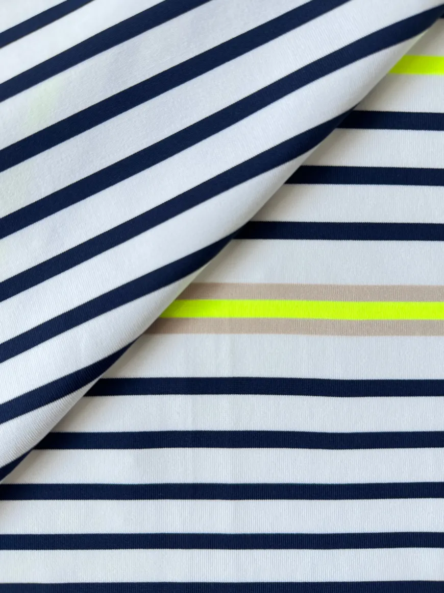 The Bahar Cream Collection features an ivory ground with navy stripes, accented by khaki and citron hues. lemlem’s unique take on a classic Breton stripe is elevated with a signature fluorescent stripe for a modern twist.