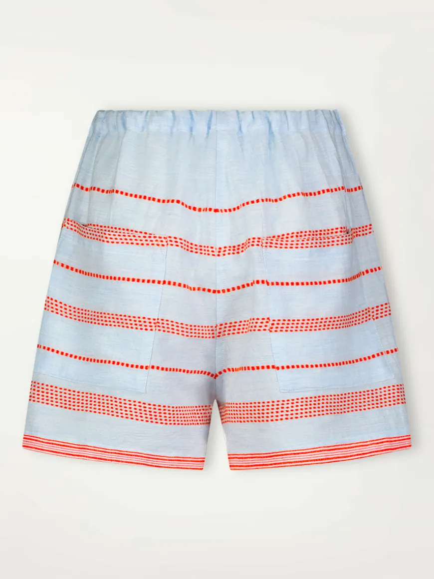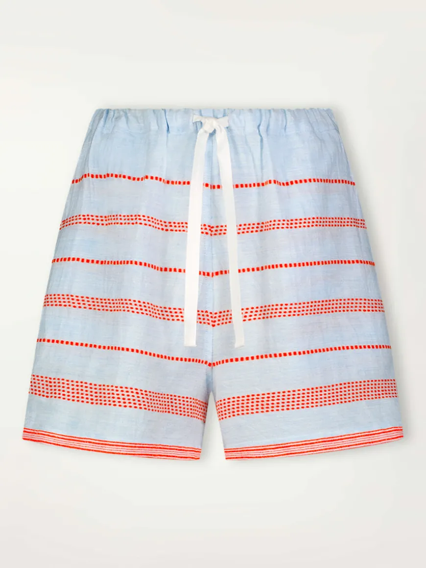 The Tiki Skypop Collection features playful pattern of red dots becoming stripes on a pale blue background. The infusion of unexpected colors and playful design perfectly captures the essence of lemlem.